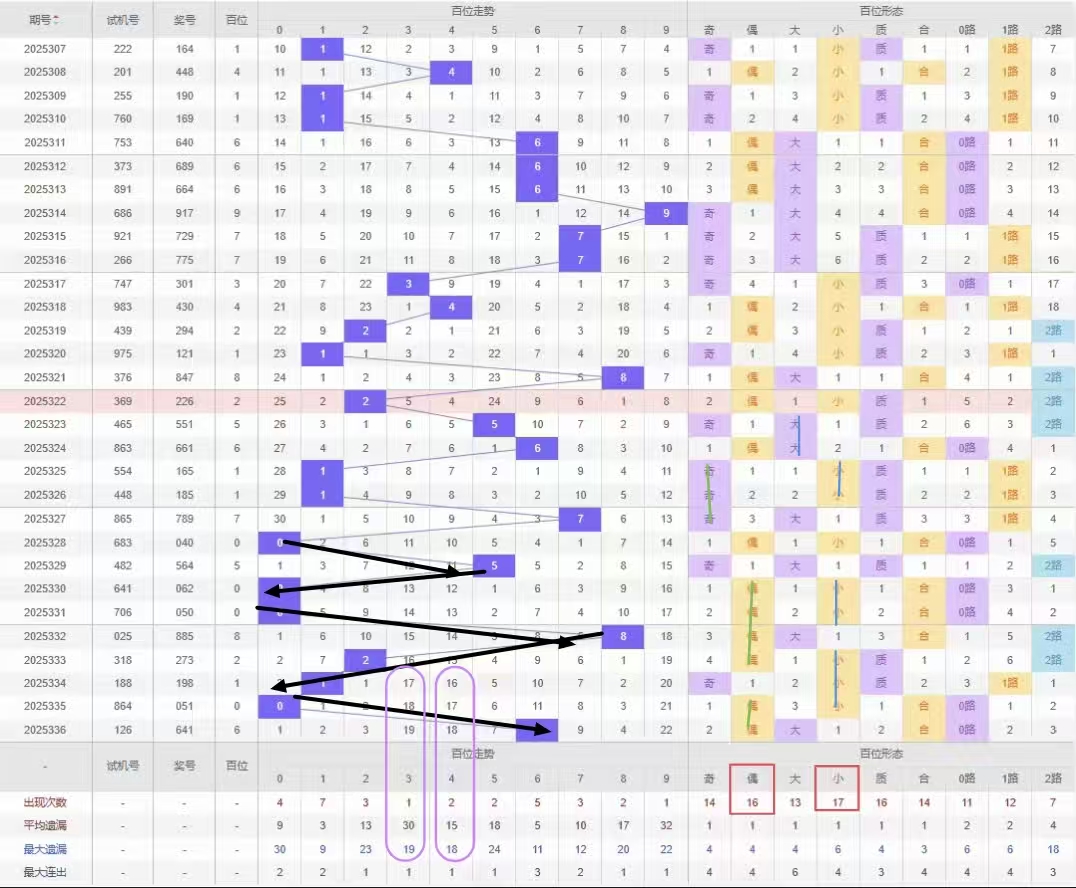 福彩3D第2025337期个位先分析奇数偶数,近15期开出奇数号9期开出偶数号6期,开出奇数号的概率稍大于开出偶数号的概率,上两期开出奇数号那么本期开出偶数号的概率较大建议选择遗漏期数较多的偶数号开出。杀号定在所有奇数号,但奇数号7号都已经遗漏了10期以上建议开出防冷号开出。