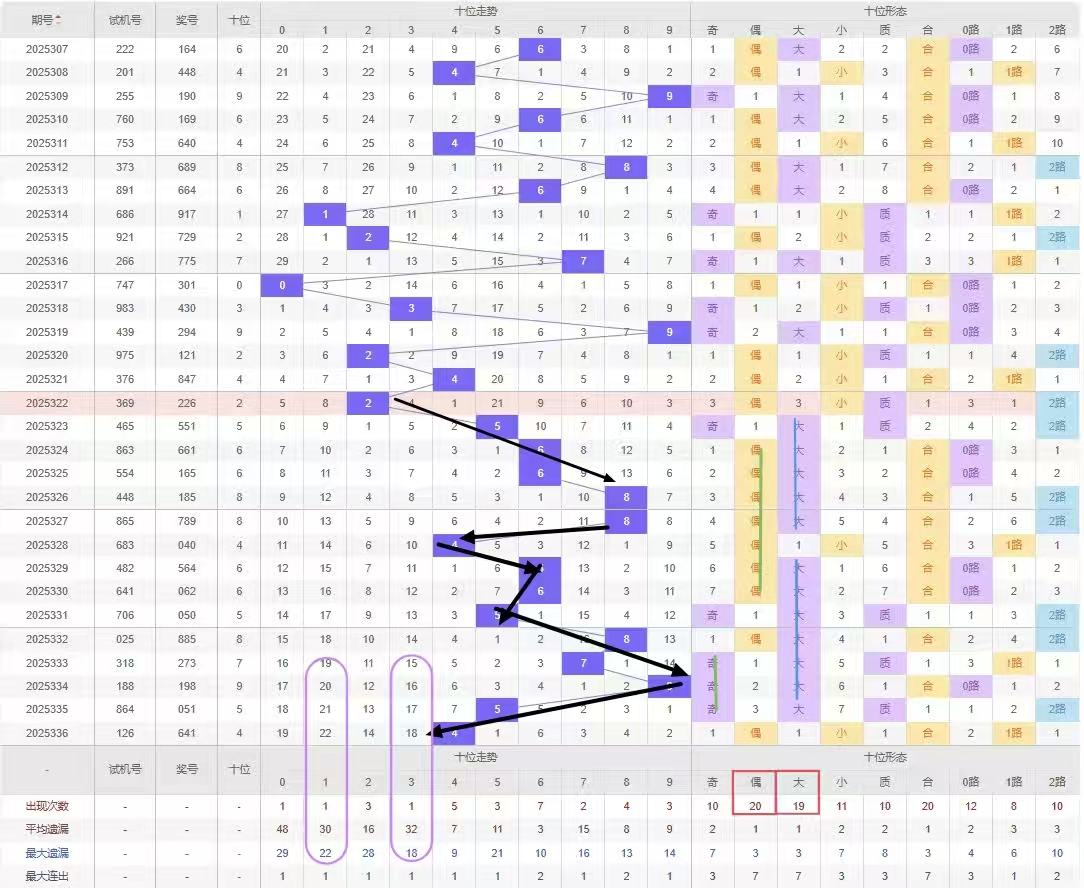 福彩3D第2025337期十位建议分析奇数偶数概率,如图所示近15期开出奇数号5期偶数号10期,开出偶数号的概率是开出奇数号概率的2倍,上期开出偶数号那么本期继续开出偶数号的概率较大建议选择遗漏期数较大的偶数号。建议杀号定在所有奇数号,但奇数号1号、3号都已经遗漏了10期以上建议开出防冷号开出。