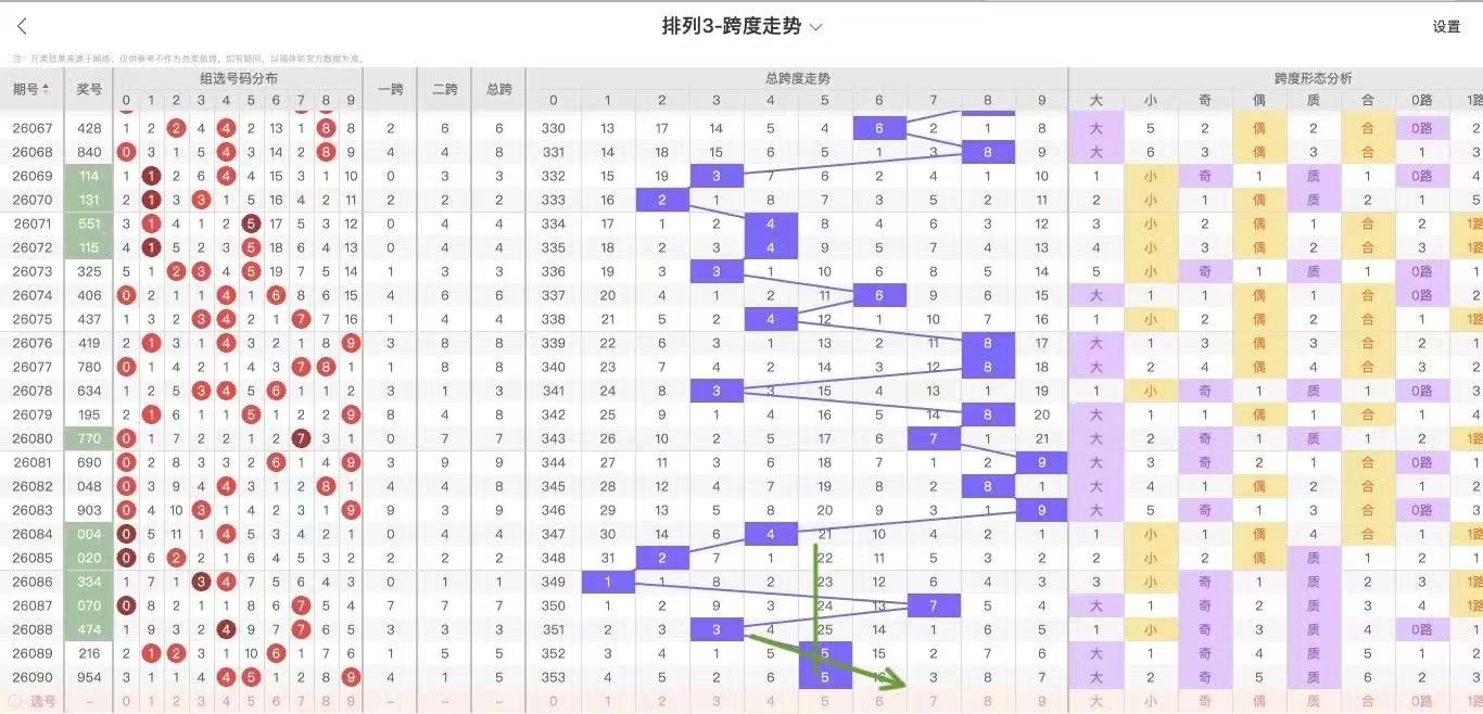 百期内跨度7开出14期,下期数据: 2 5 3 8 3 7 6 6 9 5 6 6 7近期规律下期:大:奇:质