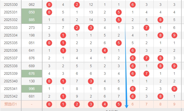 上图是福彩3D开奖号码分布走势图,你们看看上面走势图中我用蓝色箭头标注出来的地方,我这样标注的意思就是把整体号码分为两边,你们看看蓝色箭头的左边号码是不是很少,右边的号码是不是很多。那么本期个人觉得蓝色箭头的左边的数字0 1 2 3 4 5可以关注出2个或者3个。