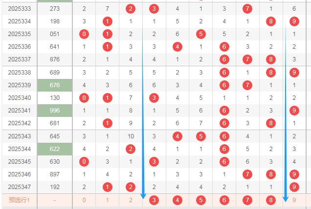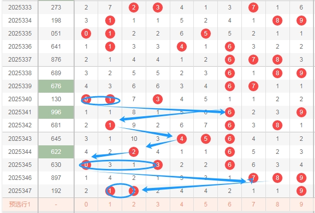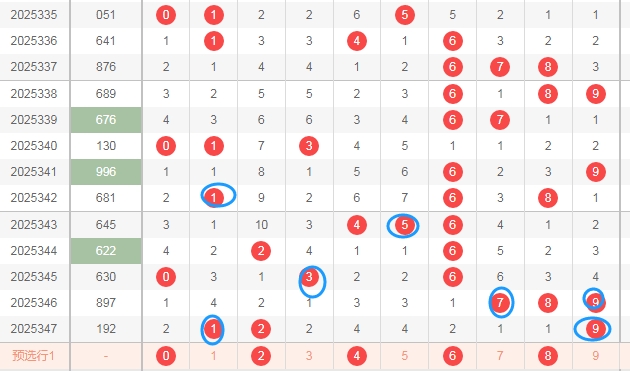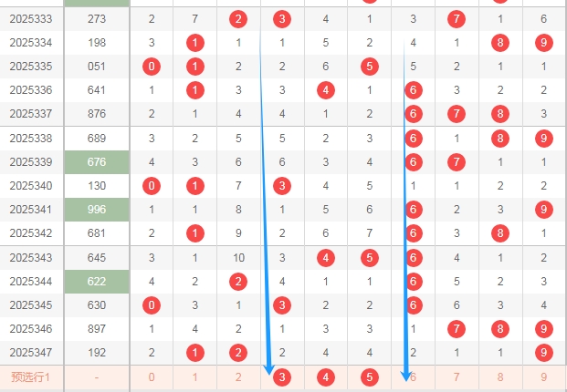 那么根据上面几张图中的蓝色箭头和蓝色圈圈,福彩3D第2025348期得到这些数据: