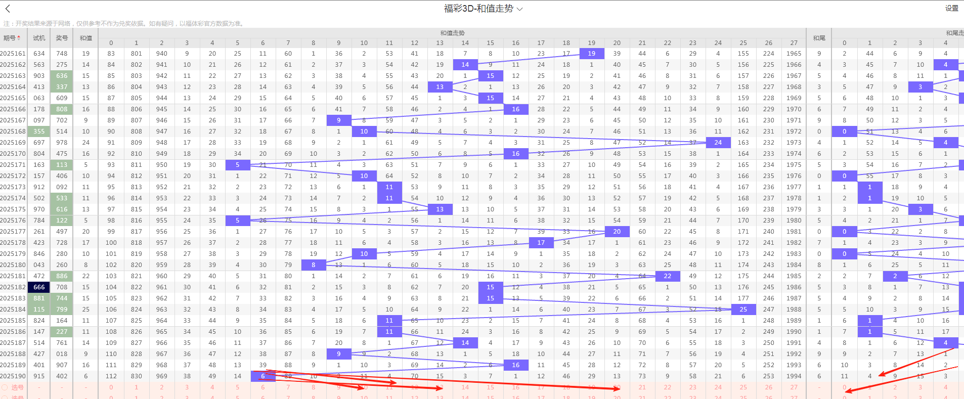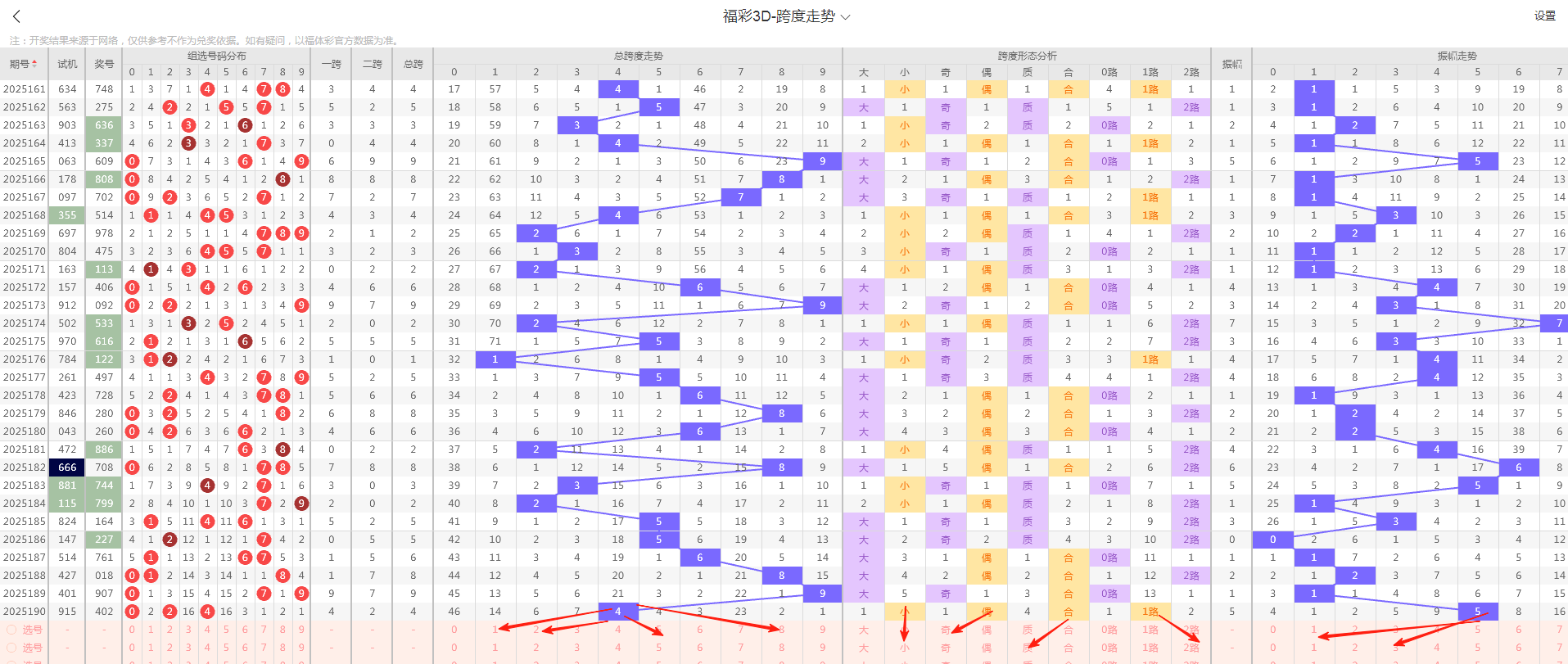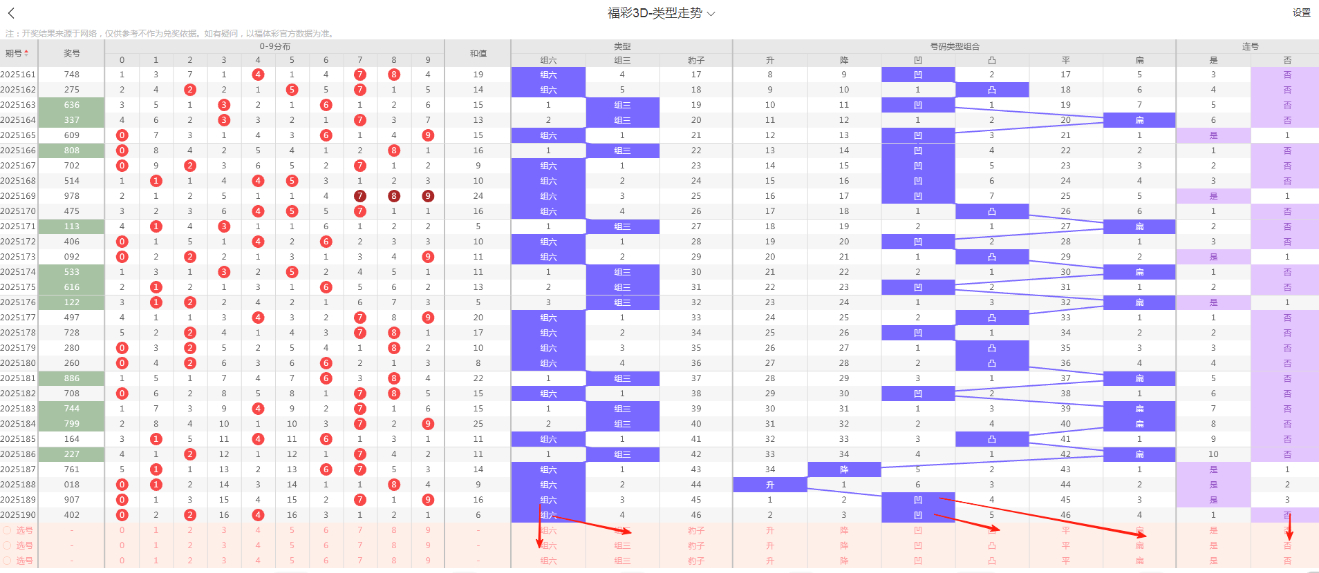 今天福彩3D第2025191期的趋势判断为:方向主看组三防六;跨度回落小跨度明显;和值回撤中区概率较大;
