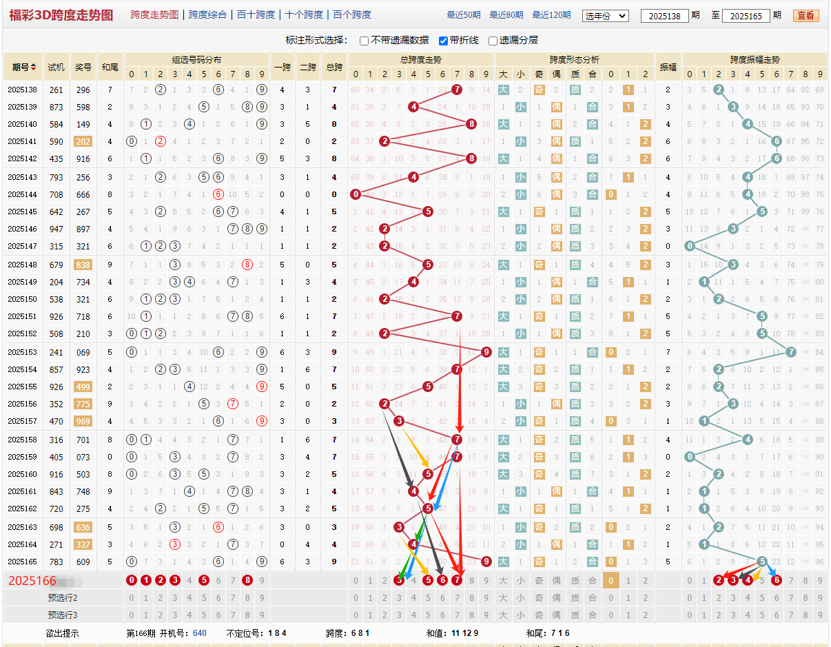 56期小跨开出32期,小跨度略强,上期开出0路大跨9跨,本期重点关注2346振幅,从012路和振幅来看01路37跨更好,166期推荐跨度:37防56