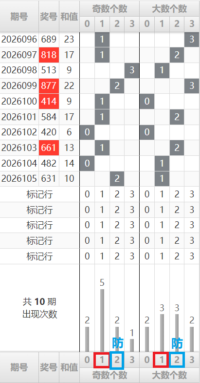 上期奇偶比为2:1,偶奇奇。奇数占据优势。纵观近10期数据,奇数虽然在上期占优,但两奇一偶形态后的修正往往伴随着偶数的回补。本期看好1奇2偶的形态,同时2奇1偶作为防守选项。