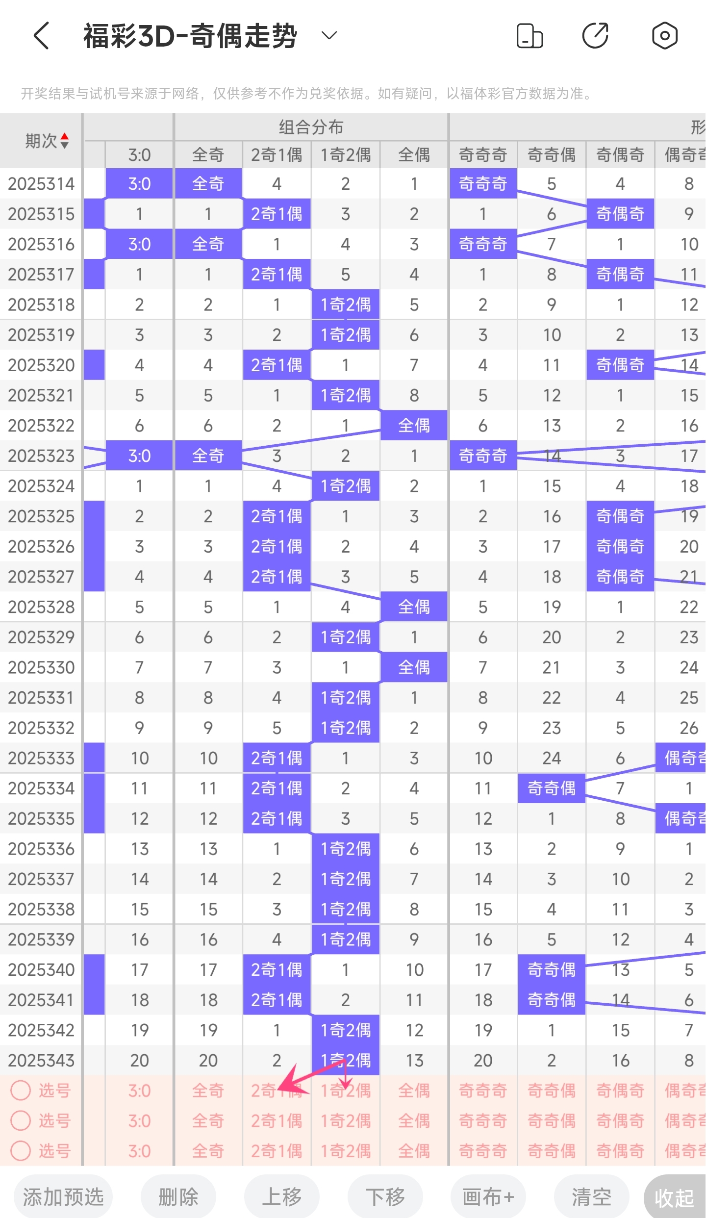 上期开了1奇2偶的情况,往前一期开出的是1奇2偶。从组合数学理论上来讲,开出2奇1偶和1奇2偶的概率都为37.5%,开出全偶和全奇的概率为12.5%。通过分析目前30期内的数据。本期的开出全偶的概率是10%,开出全奇的概率为10%,开出1奇2偶的概率为43.33%,开出2奇1偶的概率是36.66%。和前一期相比,1奇2偶概率变大,全偶概率变小。通过走势图可以看到,上期开1奇2偶,本期还是看好1奇2偶。所以本期推测可能开1奇2偶,其次是2奇1偶,然后是全奇或者全偶类型。