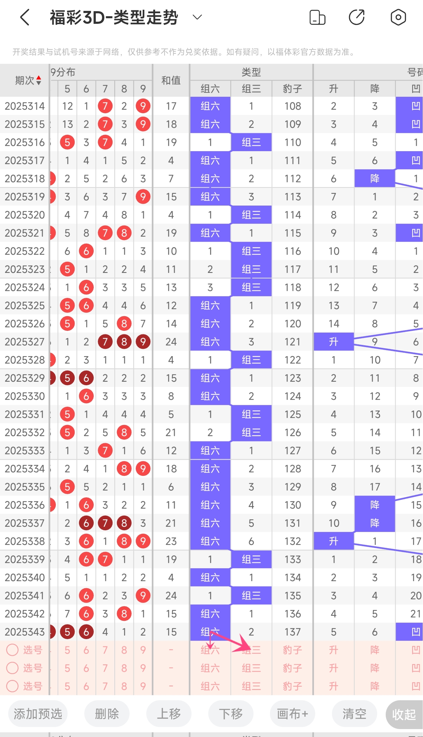 上期开出了组六类型,往前一期是组六类型。理论上开出组六的概率是72%,开出组三的概率是27%,开出豹子的概率是1%。通过分析目前30期内已经开出的概率,组六概率为66.66%,开出组三概率是33.33%。开出豹子的概率为0%。与前一期相比,组六概率变大,组三概率变小。通过走势图可以看到上期开了组六,本期继续看好组六。所以本期推测大概率开组六,其次是组三。
