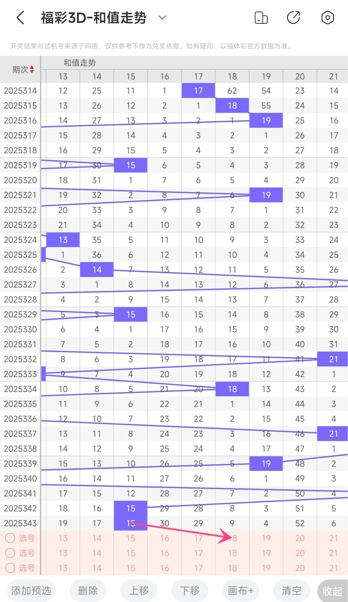 上期个位开出了5号球。往前一期开出1号球,趋势往右移动,偏移了4个点,振幅为4。通过分析走势图,目前的趋势是可能往左也可能往右。从开号规律来看,近期基本遵循左右左右开出,所以本期比较看好往左开,其次是往右。最后结合遗漏期数和冷热号。我们可以关注0,1,2,8,9等号。综上所述本期有可能开0,1,2,8,9等数。