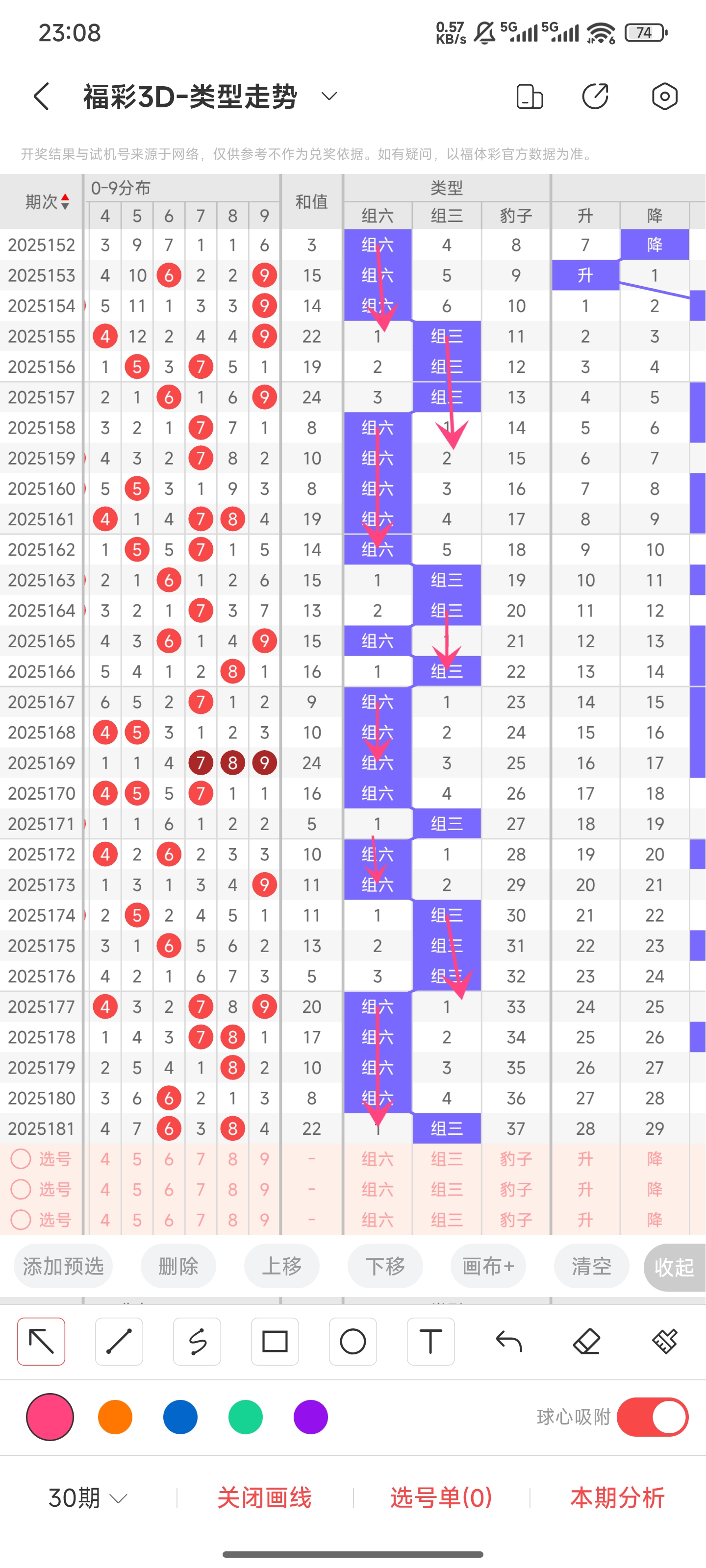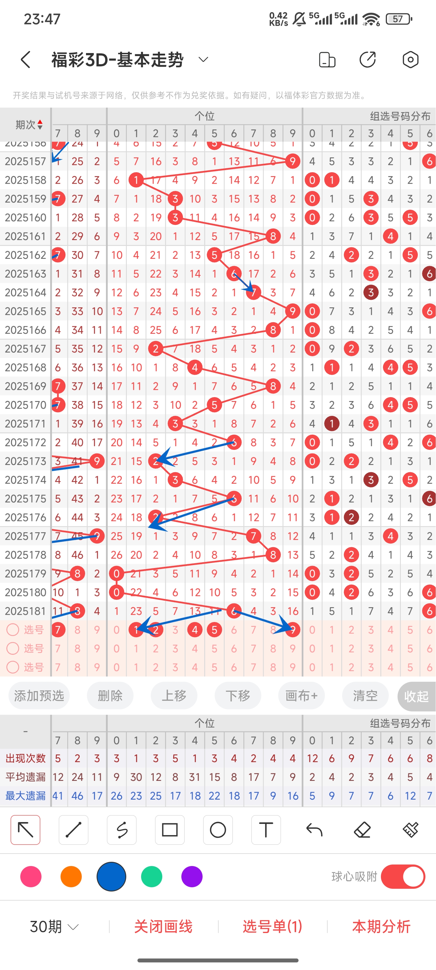 上期趋势是从左到右了,那么本期,结合近30期趋势分析,到了比较大的数字后,趋势都是往左的,那么本期很大概率是往左的。小概率往右到09号位置,让09号回归。往左的话,结合冷热号分析,那么06,05,03,0等可能出现。那么这期我们可以关注0,03,05,06,09等数字。