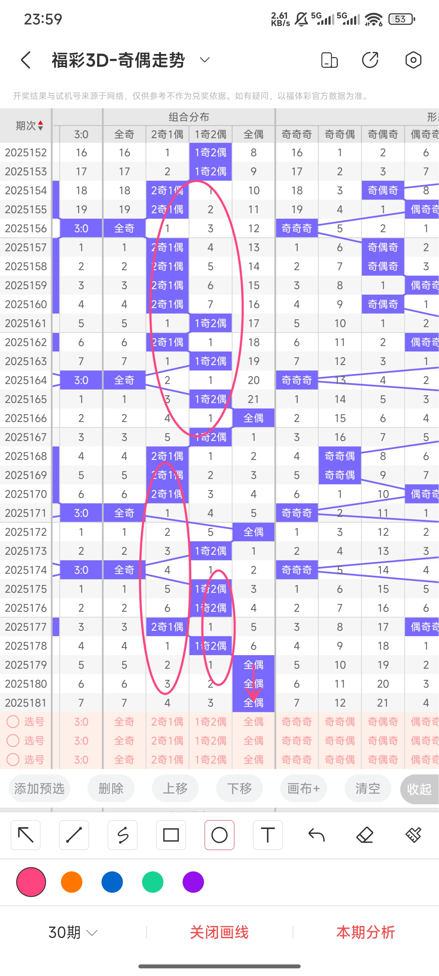 从数字组合上看,全偶或者全奇的情况是比较少的,且从近30期数据看,出现2奇1偶或者1奇2偶的次数也是比较多。比较出乎意料的是本期出现的是全偶,且已经连续出现3期了,近30期是唯一一次,那么这期还继续出现的情况从概率学上是比较小的,那么本期有可能出现2奇1偶或者1奇2偶的情况,也有可能出现全奇。