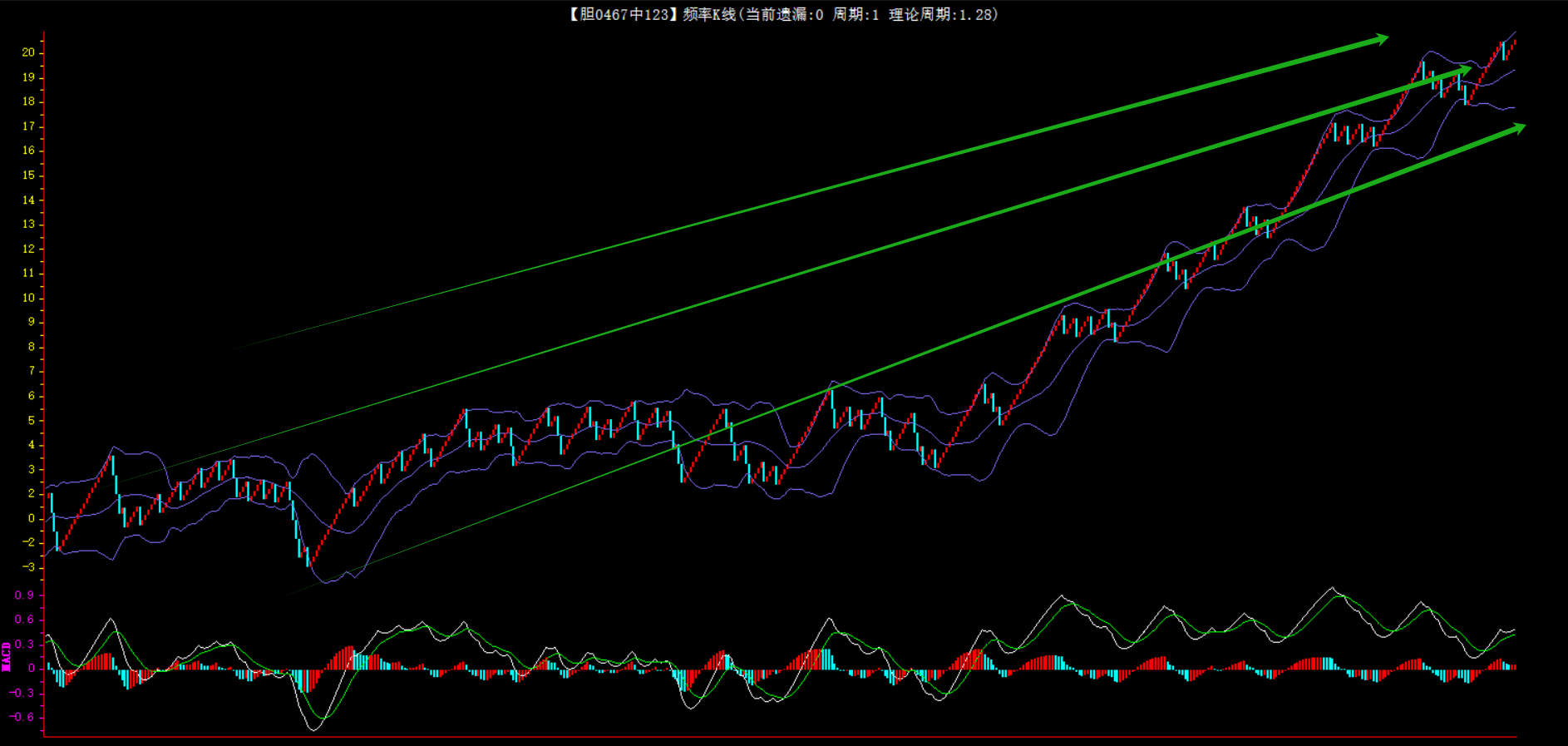 整体趋势上行,上边沿线趋势向上,下边沿趋势也是向上,节点震荡,当前连开4期,本期关注。
