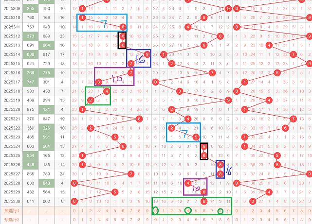 这是一张利用百位来分析十位的走势图,在百位开出了黑颜色框66,在十位同样也开出了黑颜色框66,在百位的上两期青颜色两个数字分别是1和6,两个数字相加等于7,在十位上两期青颜色两个数字分别是2和5,这两个数字相加也等于7,在百位蓝颜色框两个数字分别是9和7,两个数字相加等于16,在十位蓝颜色两个数字分别是8和8,两个数字相加也等于16,在百位紫颜色框两个数字分别是7和3,两个数字相加等于10,在十位紫颜色两个数字分别是4和6,这两个数字相加也等于10,那么轮到今天,在百位绿颜色框两个数字分别是4和2,两个数字相加等于6,相差等于2,那么在十位出现绿颜色6的时候,和6相差等于2的数字只有4和8,和6相加等于6的数字只有0,推荐十位048,文字表达可能不太清楚,大家可以观看上面的视频