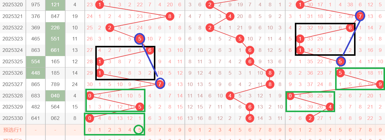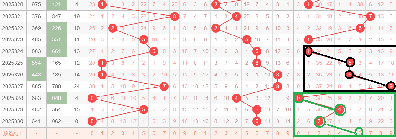 这是一张个位走势分析图,我们发现黑颜色框1559全是奇数,都是两两差4,那么今天绿颜色框会不会开出全偶,也两两差4,推荐个位6