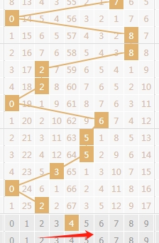 上图是福彩3D开奖号码和值尾数走势分布图,我在上面走势图中标注出来的数字是和值4尾数已经连续遗漏了67期,那么最近或者本期大家留意留意和值4尾数吧。