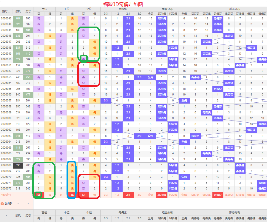 上期奇偶比是1:2,两偶的号码组合方式,从近五期的奇偶数出现情况看,奇数出现4次,偶数出现11次,奇数号码出现较少,本期侧重两奇的号码组合,侧重奇偶奇或偶偶奇的号码组合方式,根据奇偶形态做五码定位13579/02468/13579或02468/02468/13579