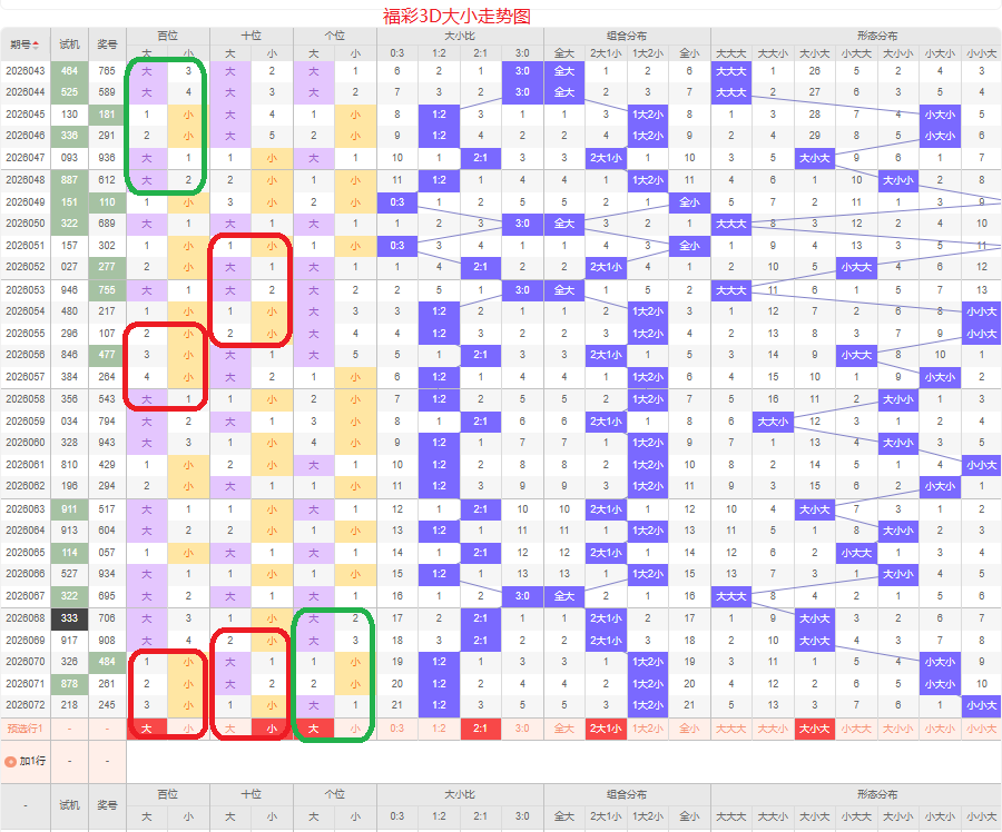 上期大小比为1:2,两小的号码组合方式,从近五期出现情况看,大号码出现7次,小号码出现8次,大小号码出现较平均,本期侧重两大的号码组合,本期百位侧重大号码,十位侧重小号码,个位要侧重看大,侧重大小大或者小大小的号码组合,根据大小做五码定位56789/01234/56789或01234/56789/01234