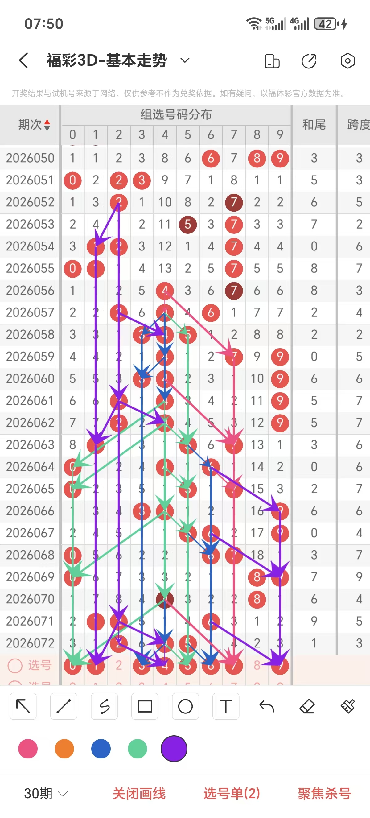 跨度通常情况下在五期之内重复一个跨度的概率很高,近五期没有重复的跨度,近五期跨度为7/9/4/5/3,近期01路的跨度较热,上期是0路的跨度,本期要侧重跨度以3/8/9跨为主的号码组合。可以从跨度方面选择相应的双胆码组合,双胆码的选取要根据近期和历史的走势进一步的分析选取。