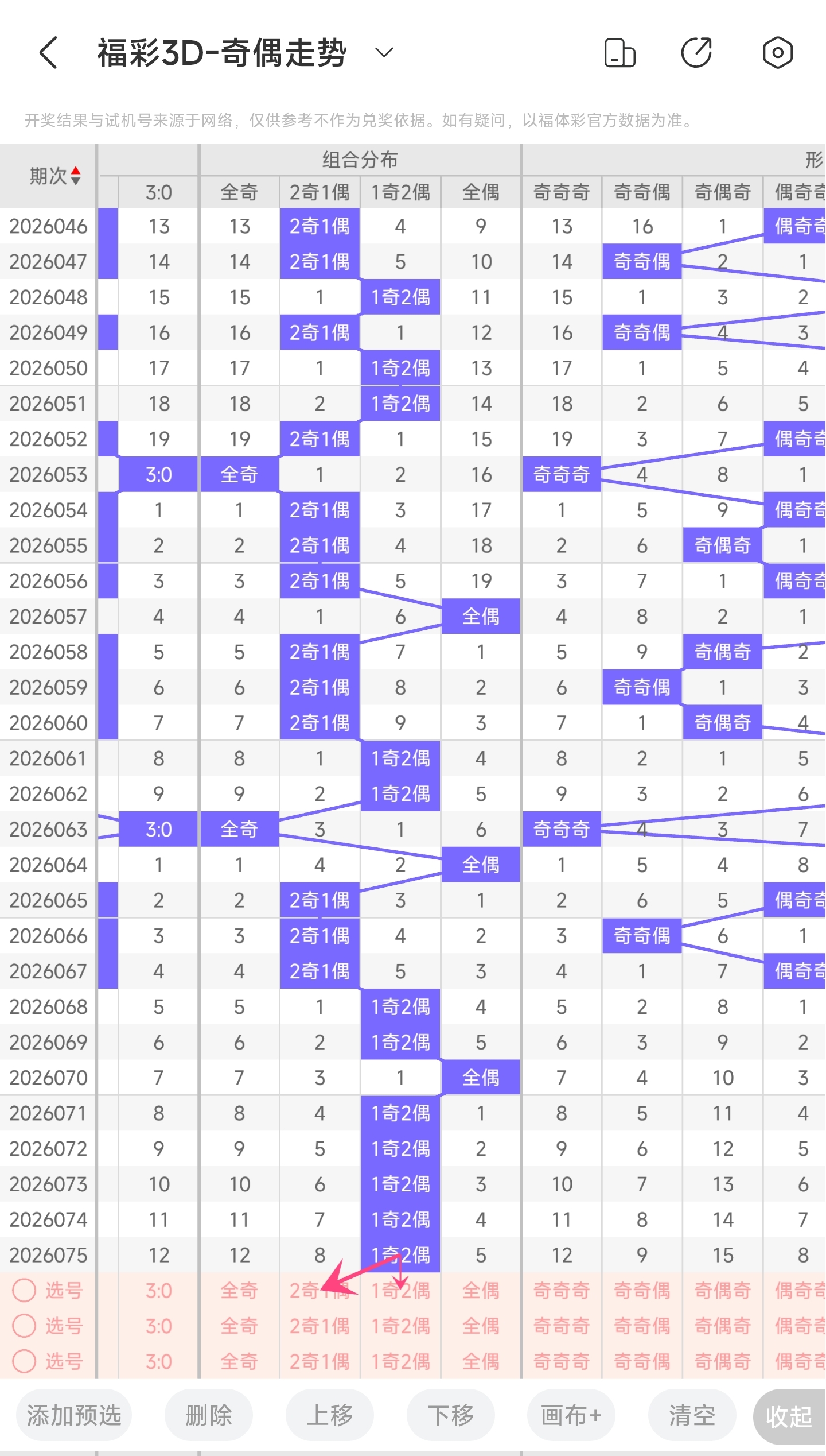 上期开了1奇2偶的情况,往前一期开出的是1奇2偶。从组合数学理论上来讲,开出2奇1偶和1奇2偶的概率都为37.5%,开出全偶和全奇的概率为12.5%。通过分析目前30期内的数据。本期的开出全偶的概率是10%,开出全奇的概率为6.66%,开出1奇2偶的概率为40%,开出2奇1偶的概率是43.33%。和前一期相比,1奇2偶概率变大,2奇1偶概率变小。通过走势图分析,上期开了1奇2偶,推测本期可能开2奇1偶,其次是1奇2偶,然后是全奇或者全偶类型。