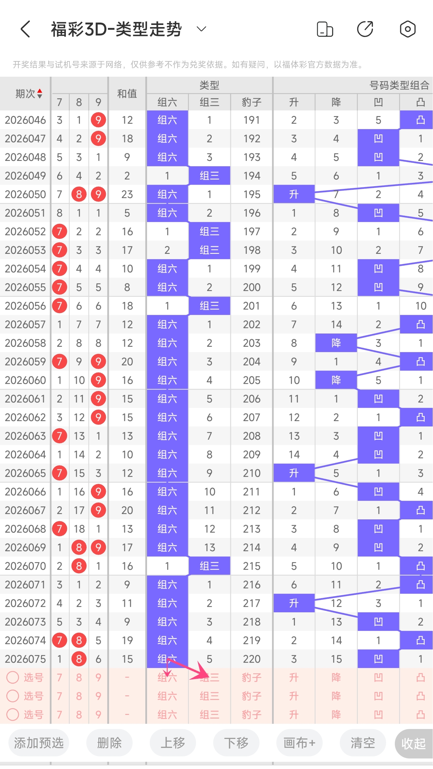 上期开出了组六类型,往前一期是组六类型。理论上开出组六的概率是72%,开出组三的概率是27%,开出豹子的概率是1%。通过分析目前30期内已经开出的概率,组六概率为80%,开出组三概率是20%。开出豹子的概率为0%。与前一期相比,组六概率变大,组三概率变小。通过走势图可以看到上期开了组六,推测本期可能开组六,但要考虑组三可能又回补。所以推测本期大概率开组六,防开组三。