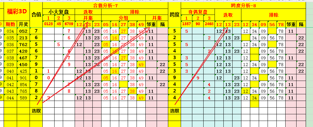 福彩3D和值范围为0–27,和值尾(合值)与跨度值0–9的十个数字吻合。分别将合值及跨度值进行分组,划分为“复盘、选取、排除”列。