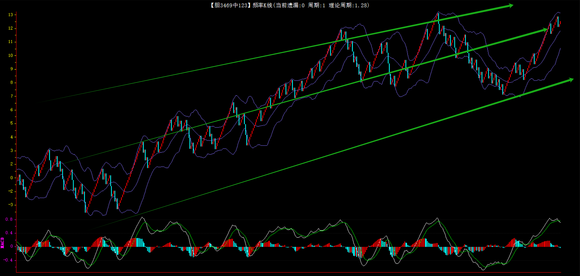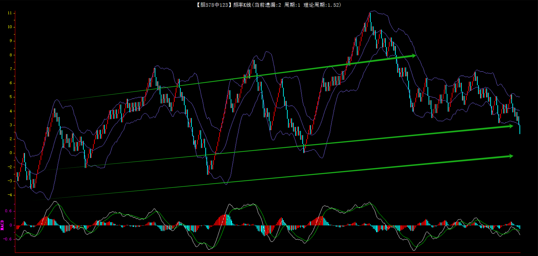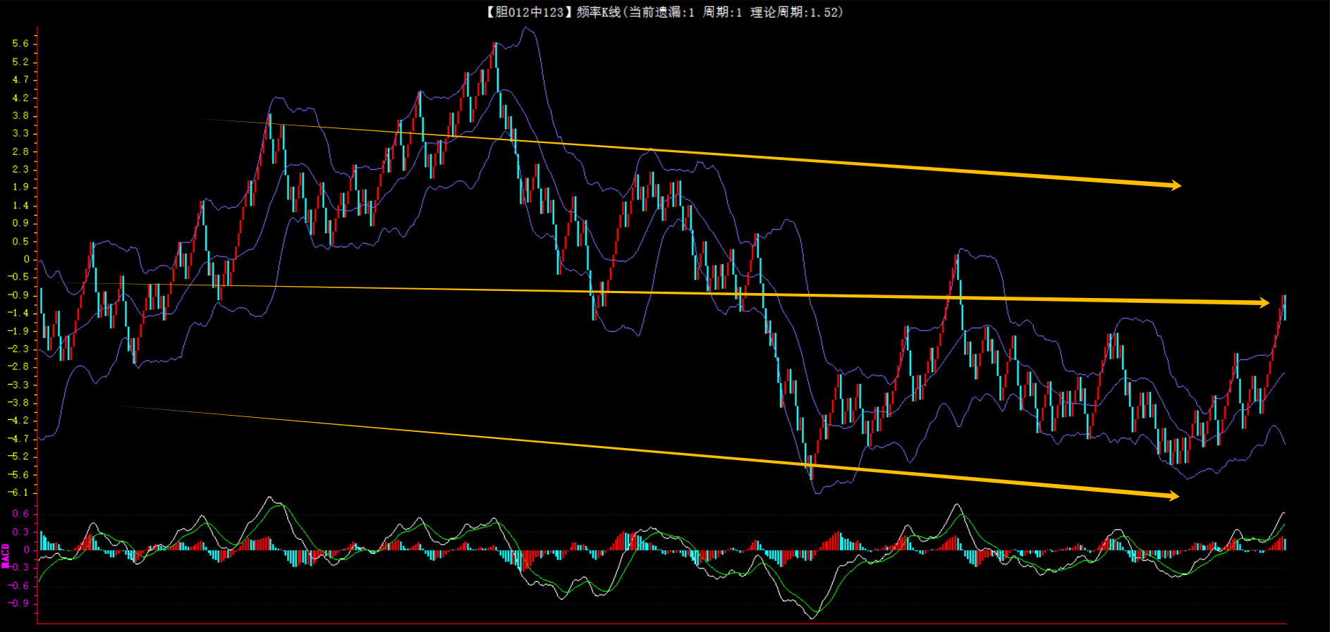 整体趋势下行,上边沿线趋势向下,下边沿趋势也是向下,节点震荡,当前遗漏1期,本期防守。