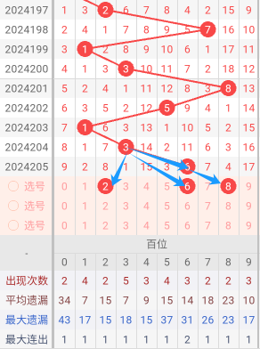 现在我给大家分析下,本期百位可能开出的号吗,上期开出了6,193期开出了6号码球,194期开出了1号码球,195期开出了7号码球,196期开出了0号码球,197期开出了2号码球,198期开出了7号码球,199期开出了1号码球,200期开出了3号码球,201期开出了8号码球,202期开出了5号码球,203期开出了1号码球,204期开出了3号码球,205期开出了6号码球,根据这六期的走势和历史50期内的走势对比,我们可以先考虑本期可能会出大号,下面我给大家推存百位可能开出的几个号,个人比较看好268,百位我们就先暂定这两个号。本期关注2-8之间的号码,同时关注遗漏期数较小的号码。按最近遗漏走势,开了遗漏期数较小之后开遗漏期数大的可能性比较大。