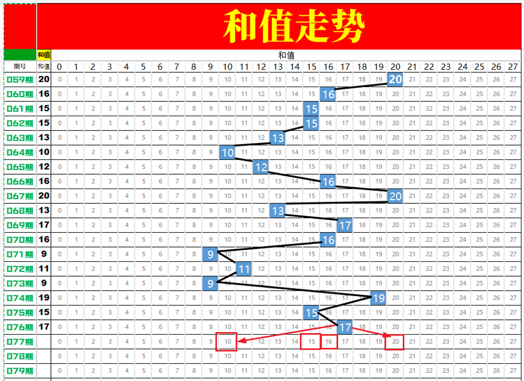 最近这几期给我的感受是,和值虽然比较好,但是也是非常难猜的。我们只能是大概判定下走位,是走大还是走小,然后在进行号码的选择。如果说去百分百确定个和值,然后根据和值再去选择号码,这个风险还是很大的。也就是说,如果这个总的条件定错了,后面做的任何工作都是徒劳。