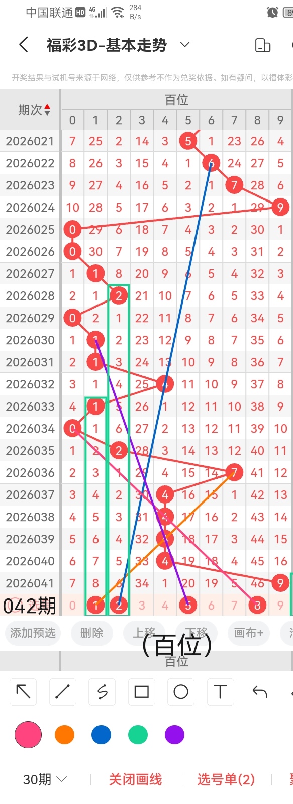 首先,为了感谢各位老板对小梁的关注和打赏,小梁特别提供一个杀个位的小技巧,同尾杀号法,准确率相还可以,但是要记住任何杀号都不能保证百分百准确的哦。小梁根据同尾杀号法,得知本期杀个位2。其次,小梁参照上图中的画线思路走位可以看出,号码0与前几期开出的号码呈斜三连的走位且呈隔两期回补的走势,跨度是1;号码3与前几期开出的号码呈斜三连的走势且呈隔六期回补的走位,跨度2;号码5与前几期开出的号码呈隔期回补的走位且呈斜连前后相互对称的走势,跨度为4;号码7与前几期开出的号码呈隔三期回补的走势且呈斜三连的走位,跨度6。综上所述,小梁根据上图中画线的思路可以看出,推荐个位的号码是:0、3、5、7。