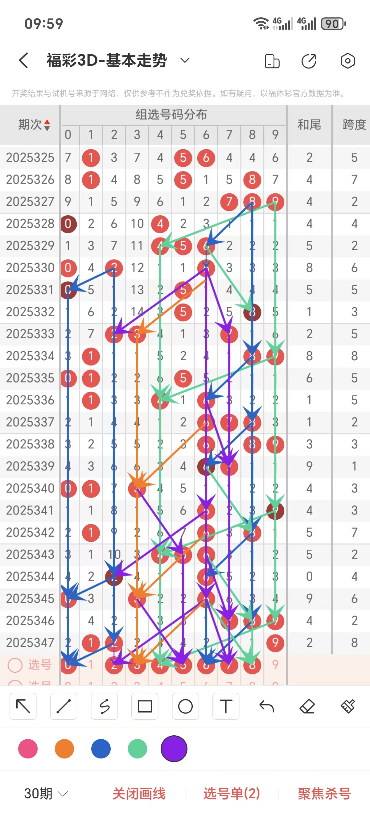 跨度通常情况下在五期之内重复一个跨度的概率很高,近五期重复了2的跨度,近五期跨度为2/4/6/2/8,近期2路的跨度较热,上期是2路的跨度,本期要侧重跨度以3/4/5跨为主的号码组合。可以从跨度方面选择相应的双胆码组合,双胆码的选取要根据近期和历史的走势进一步的分析选取。