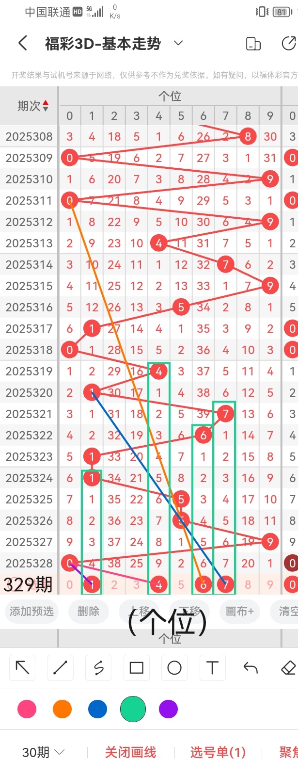 首先,小梁为了感谢各位老板的关注和打赏,特提供一个杀个位的小技巧,同尾杀号法,准确率相当高,但并不代表不出。根据同尾杀号法,得知本期杀个位9。其次,我们根据图中画线的思路可以看出,号码1与前几期开出的号码呈斜连的走位且呈隔四期回补的走势,跨度为1;号码4与前几期开出的号码呈斜连的走势且呈隔九期回补的走位,跨度为4;号码6与前几期开出的号码呈斜三连的走位且呈隔六期回补的走势,跨度为6;号码7与前几期开出号码呈斜三连的走势且呈隔七期回补的走位,跨度为7。综上所述,小梁依据图中画线思路推荐个位的号码:1、4、6、7。