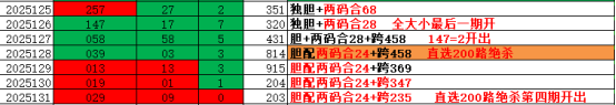 131期开出了203全小组合,全小组三出现连开,偏态行情继续走强。十位和百位直落。胆配两码合连开三期,胆配两码合配跨连开2期。昨天开出200路直选,128期文章中当时判断遗漏9之前处于绝杀状态,结果遗漏6这个点开出,小于遗漏9开出。昨天的三但开出2个,双胆开出一个,独胆开出,两码02,03开出,两码合24开出,跨度234开出。胆配合均开出。昨天的指标全部开出,胆码目前已经开始进入反弹周期,可以顺势而为了。近期全大小走势持续走强,主要是全小组合带动了这个指标的走强,短期还没有出现回调的迹象,继续顺势而为。从目前的偏态行情来看,继续走偏态还是大概率。