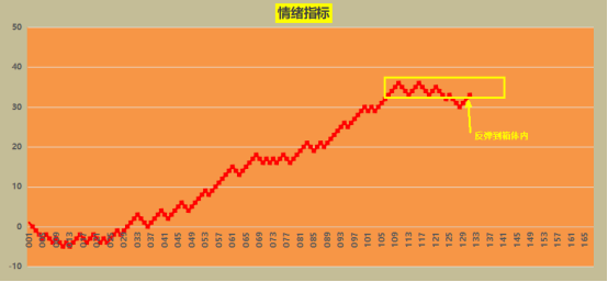 图中显示情绪指标连续反弹了3期,现在又回到了前期的箱体内了,目前至少止跌了,短期大概率要在这个箱体内震荡,真正的起涨行情要等这个箱体突破上去才行。目前反弹延续,继续顺势。