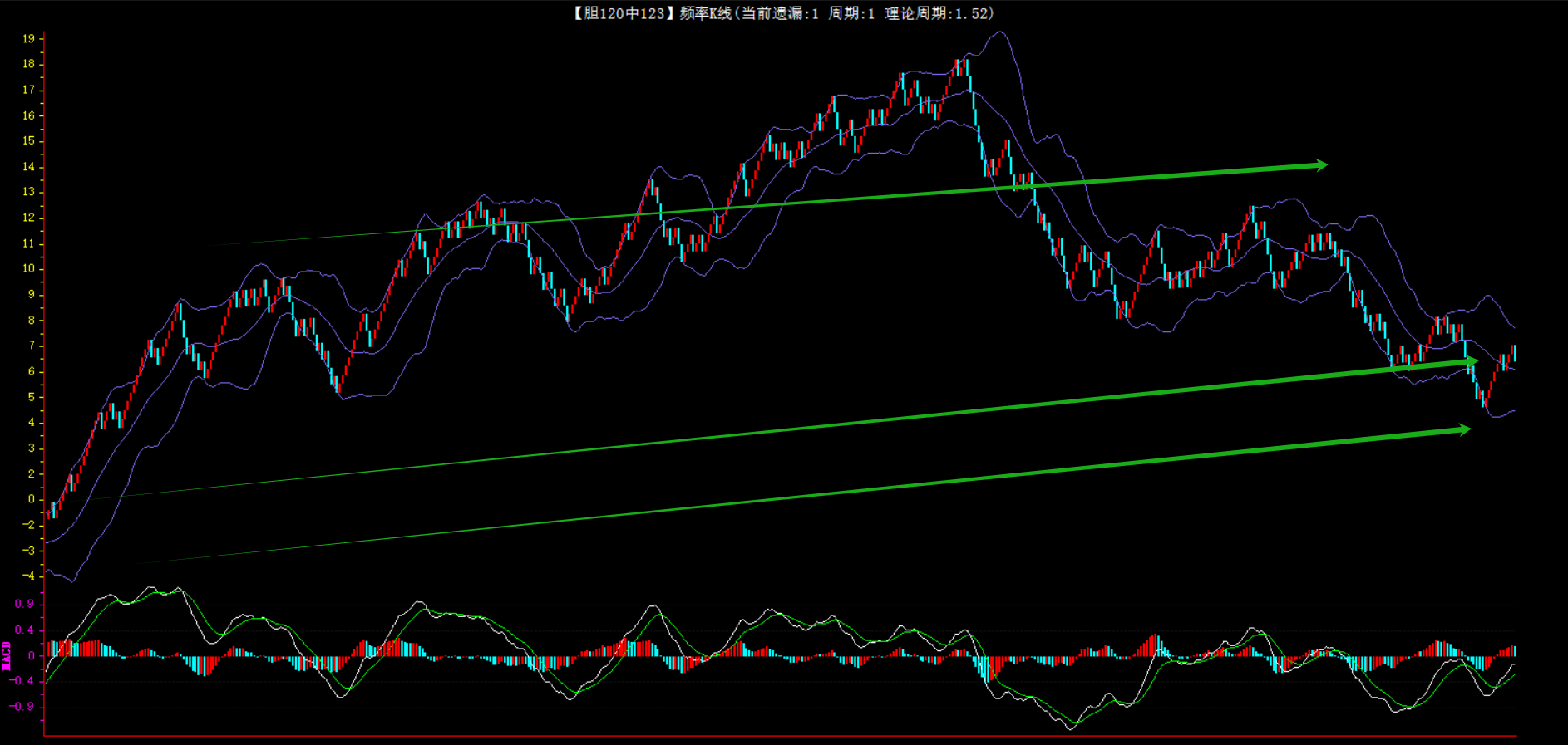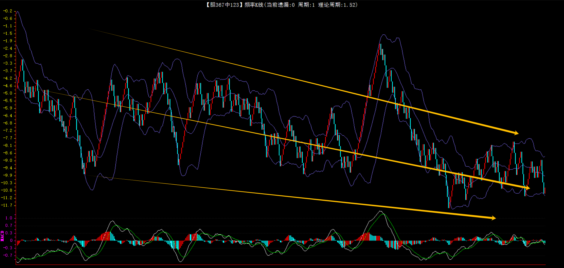 整体趋势下行,上边沿线趋势向下,下边沿趋势也是向下,节点震荡,当前开1期,本期防守。