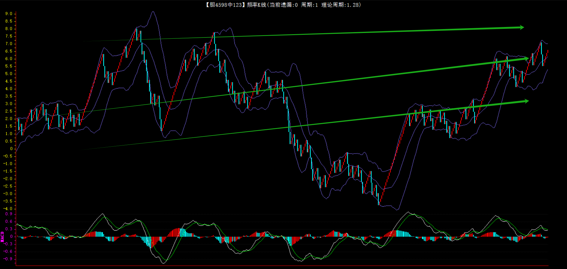 整体趋势上行,上边沿线趋势向上,下边沿趋势也是向上,节点震荡,当前遗漏1期,本期关注。