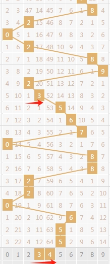 上图是福彩3D开奖号码和值尾数走势分布图,我在上面标注出来的数字3尾数和值遗漏了12期上次遗漏了20期,和值4尾数遗漏了64期,那么本期或者近期这两个尾数的和值还是值得大家去关注的。