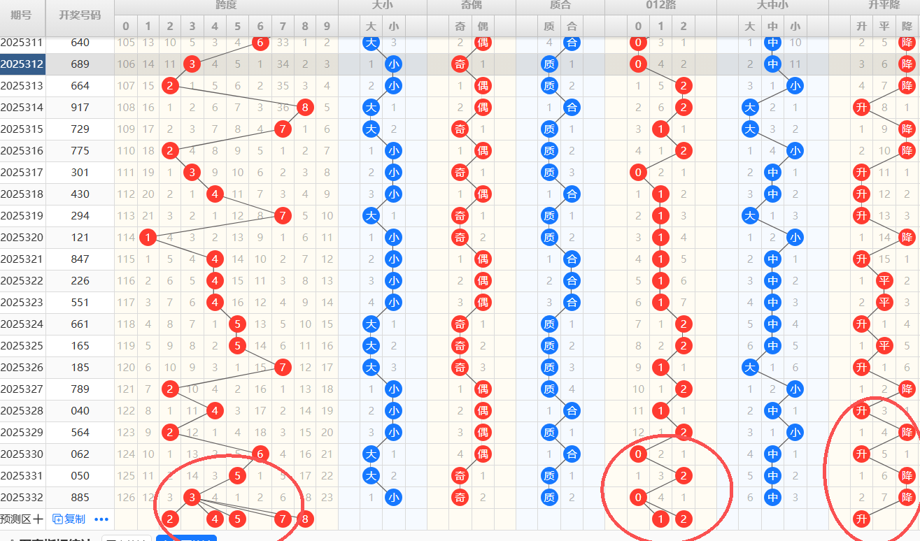 上期开出0路跨度3,本期跨度主看上升,跨度范围可选3-9,可对2跨进行防守。从跨度的012路走势来看开出1/2路跨度的概率较大,本期跨度可选4/5/7/8防守2跨开出。