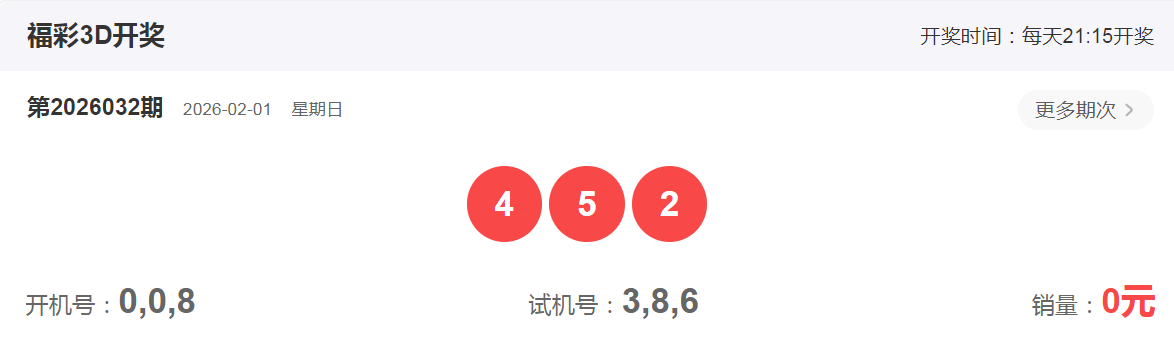 福彩3D2026年2月1日第032期开奖号码是452,组六形态,跨度3,和值11,小大小