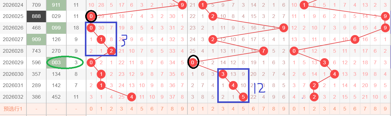 这是一张全区走势分析图,利用百位来分析十位,在百位开出了黑颜色0,接着开出了蓝颜色框012的顺子,在十位同样出现了黑颜色0,然后接着出现蓝颜色框345,百位蓝颜色框012和十位蓝颜色框345,正好形成了012345的自然顺子,在百位蓝颜色框012,这三个数字相加等于3,在下期就出现了组三003,003就是3的和值,蓝颜色框012是3的和值,下期就开出003的和值3,在十位蓝颜色345,这三个数字相加等于12,那么在下期会不会开出12的和值,在百位蓝颜色框012,下期开003,这个00就是蓝颜色框中的00,那么今天会不会开出33,44,55的组三号码,蓝颜色345就是12和值,那么33加6等于12和值,44加4等于12 和值,55加2才能等于12,今天小盘当中没有任何的思路,在这里就陈述了,在百位连续开出了8期全小的号码,个人看不出任何走势,文字表达不太清楚,大家可以观看上面的视频
