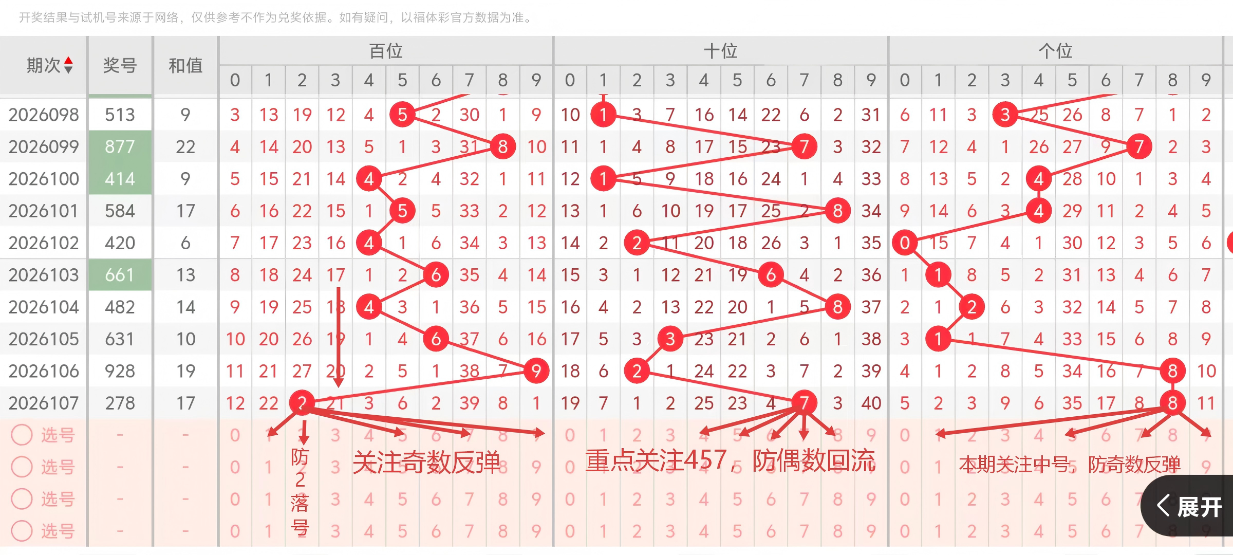 · 数字3:近5期仅在第105期十位出现一次,之后连续两期隐身,也可适度留意。