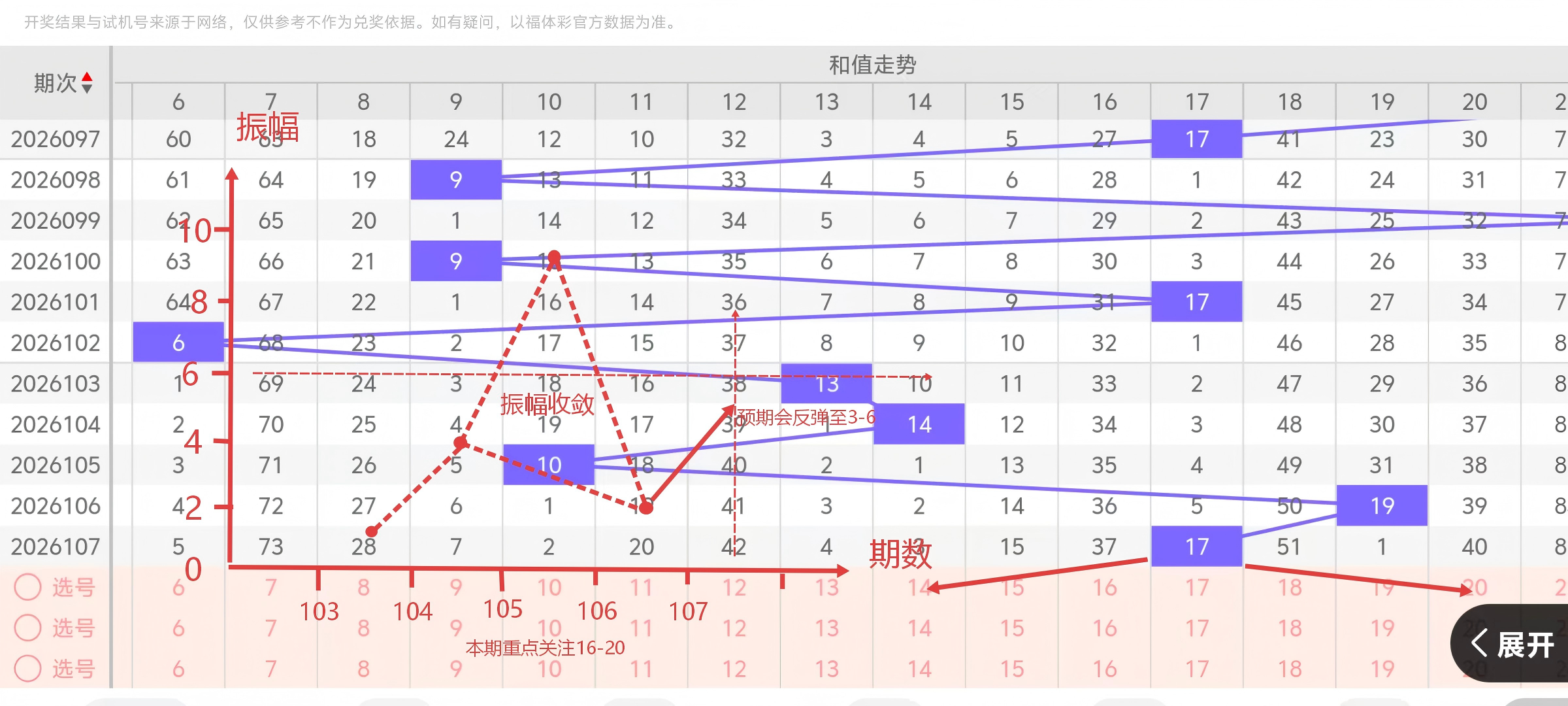 近5期和值:13、14、10、19、17,振幅序列:1、4、9、2。上期和值17属于中高位,振幅收敛至2,显示波动趋缓。从历史成交区间看,13-19区间的和值分布较为密集,且近期无明显回落至10点以下的信号。结合107期和值17,本期若振幅按2-4估算,和值范围约为13-21,但考虑到高位震荡的惯性与近两期都未低于17的特点,应重点重点关注16-19。和尾方面,和尾7(对应17点)已连续两期未出现,可适度关注回补。
