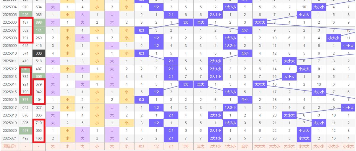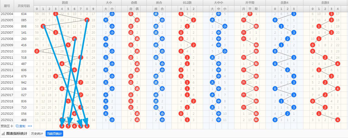 跨度预判 跨度是福彩3D中一个重要的技术指标,它反映了开奖号码中最大值与最小值之间的差值。上期跨度为4,根据跨度走势图,本期跨度3和7的出现概率较低,而跨度4、5、6则相对较为热门。综合分析后,认为跨度极大概率会落在4至8的范围内,特别是4、5、6、7、8这几个跨度值应重点关注。
