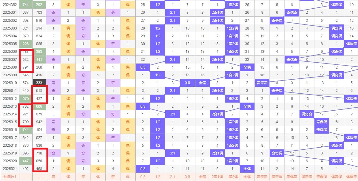 奇偶比例分析 奇偶比例同样是福彩3D分析中的重要一环。022期奇偶比为0:3,即3个偶数。从近期走势图来看,奇偶比例分布较为均衡,没有出现明显的偏态。因此,本期可以继续关注1:2或者2:1的奇偶比例。可以根据这一比例进行号码筛选。