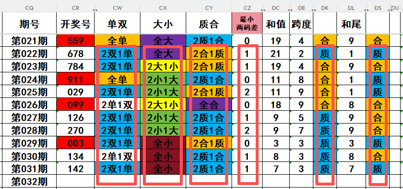 4,最近10天当中,最小两码差0开出3次,最小两码差1开出5次,最小两码差2开出2次,最小两码差3开出0次,