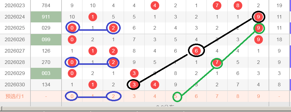 这是一张小盘走势分析图,黑颜色是坐标,黑颜色9间隔两期后开出黑颜色6,再间隔两期后开出黑颜色3,形成了963的全0路号码等距,第一次黑颜色9的下期开出了蓝颜色02组合,第二次黑颜色6的下期同样也开出蓝颜色02组合,那么轮到今天,黑颜色坐标3的下期会不会开出02组合呢,绿颜色箭头会不会形成975的全奇等距呢