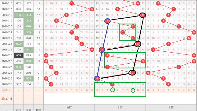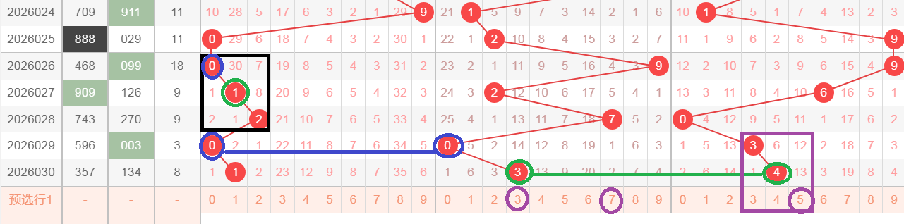 这是一张百位全区分析图,在百位开出了黑颜色框012,012是全小的顺子,黑颜色框中0在下期开出了蓝颜色0减0等于0,在黑颜色框中1在下两期开出绿颜色4减3等于1,那么轮到今天,在黑颜色框2在今天会不会开出两码差2,两码差2的组合有很多,那么我们可以看各位,会不会开出紫颜色345的等距,文字表达不太清楚,大家可以观看上面的视频