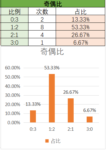 上期奇偶比为1:2,其中1:2占比变大,2:1占比变小。近15期内1:22:1优势最好,其次是0:3,最后是3:0上期开了1:2奇偶比,本期看好2:1奇偶比的开出,其次是1:2