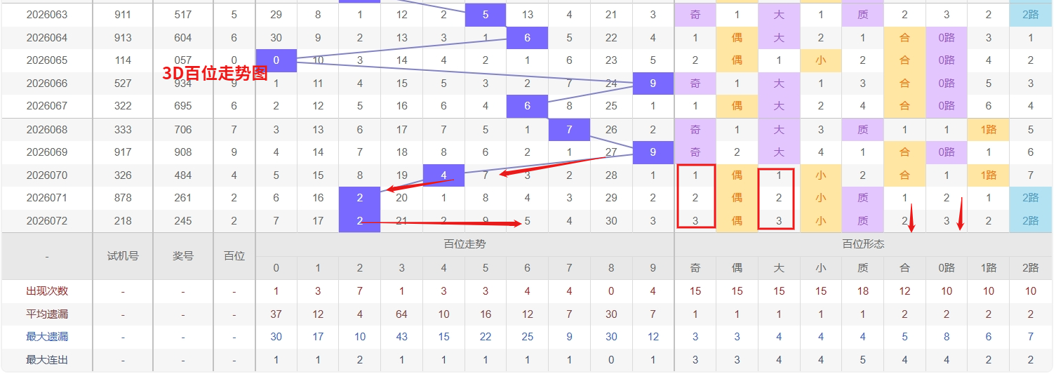 福彩3D百位分析:第2026072期百位开出号码2属于小偶数,从上面百位走势图上可以看出近100期大小比约为48:52奇偶比约为55:45。近期数据还是比较极端的符合文章开头介绍的求均衡规律非等量现象。但这种均衡不会持续最终会被偏态运行打破,然后循环往复。但短期内大小相差0点,大数过热小数有回补需求本期个人认为走小数的概率更高。上期百位落号“2”号球,在百位号码开出2路号码2后向小数方向走出0个振幅。那么通过分析上期百位落位号码分析,号码走出0个振幅,号码走为小偶数,开出2路号码2。通过对百位落号趋势来分析,百位号码落位前端,通过对近10期的走势来看百位号码大小交替频繁走2期大数又走3小数,3D百位走势上,近期7号的表现可谓炙手可热,已然成为该位置的核心热号,从出号节奏来看,其密集出现的态势具备明显的惯性特征,在热度尚未明显消退、走势形态也未出现转折信号之前,需要重点设防7号继续连下,这种热号持续走强的模式在百位历史上并不少见,往往会在短期内形成一波集中回补的行情。与此同时,8号则处于截然不同的冰点状态,目前遗漏值已达30期未出,在百位冷号序列中属于严重超期未开的状态,从号码平衡规律和冷热转换的周期性角度来看,如此长时间的空缺已经积累了极强的反弹动能,我们在百位关注的重点在13578这5个号码球上,百位号码近期奇偶切换频繁,2号球码属于2路号码偶数,现偶数开出过多有向奇数的趋势。所以福彩3D第2026073期百位看13578