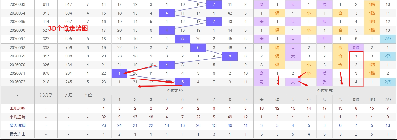 福彩3D个位分析:第2026072期个位开出号码5属于大奇数中端,从以上个位走势图中可以看出近100期的大小比约为48:52奇偶比约为54:46大小奇偶数据上有点差异有需求但不是太明显,不太好看这时就要借助连线走势和遗漏数据来帮助我们缩水号码。上期个位落号“5”大奇数2路号码球,号码开出了4振幅,连续多期的大振必被小振幅取代幅符合我们的预期,那么本期我们在个位考虑振幅走势走前依然要转变思路考虑大振幅,具体考虑(2-6)个振幅是我们主要的方向,那么在对个位落号情况进行系统的分析时我们可以明显的看到个位号码走势呈现大范围震荡,尤其是在号码的落位特点上表现的尤为突出,那么本期我们在个位分析时就要注意号码的风险,避免出现踏空。3D个位走势上,近期4号表现活跃,已然成为该位置的热门号码,从出号节奏和形态来看,其热度具备一定的连续性,短期内仍有连下的可能,值得重点关注。而8号则处于明显的冷态之中,长期未出导致遗漏值不断累积,从冷热平衡的角度来看,冷号在沉寂过后往往存在较强的回补需求,反弹预期正在逐步增强。综合而言,在接下来的个位选择中,既要把握4号作为热号的延续动能,也要防范8号在长冷之后随时可能出现的回补走势,因此福彩3D第2026073期个位看好01248。