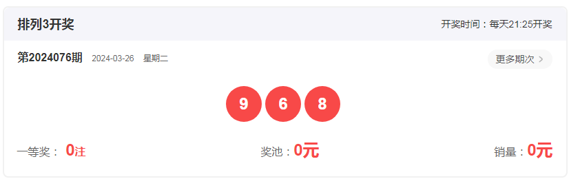 排列三第76期开奖回顾:开奖号码:968,形态:组六