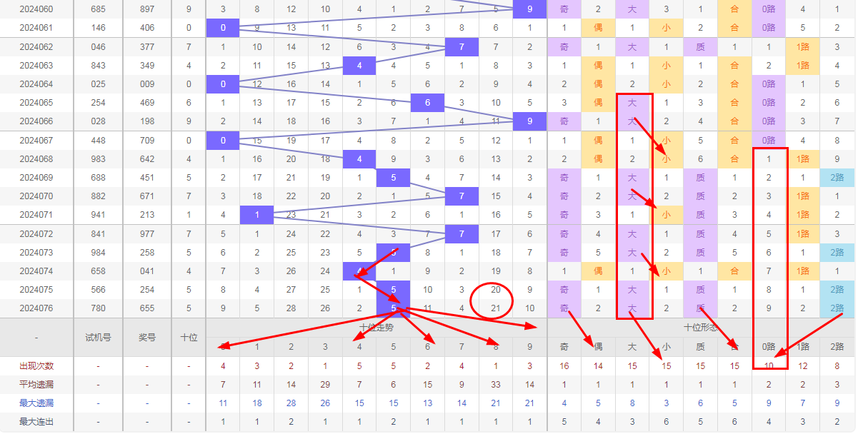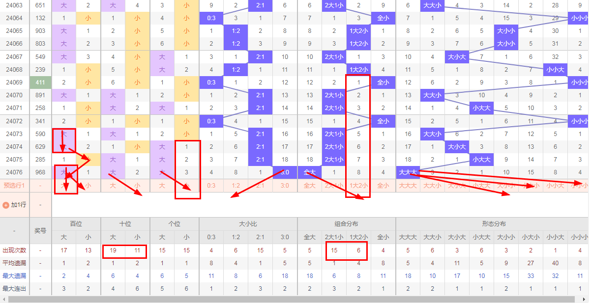 排列三 大小形态分析:从大小走势图上可以看出排列三100期内百位大小比为46比54,十位大小比为51:49,个位大小比为53比47除了十位偶数比奇数多,百位和十位都是奇数比偶数多。历史数据近3期开出大大大后下一期的走势为,第38期开出大大大第39期开大小小。第40期开出大大大后第41期开大大小,第67期开出大大大后第68期走小大小。可以看出开出大大大形态后形态转变过快,不过还是能看出开出大大大形态后下一期还是比较规律的进行切换,这时遗漏数据就显示作用的时候,结合遗漏数据再加上开出大大大形态后容易进行下一个类型变化。所以排列三第77期大小形态推荐2小1大防全小。