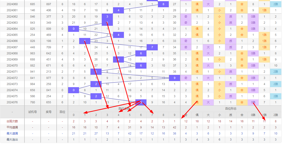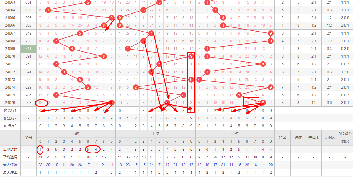 排列三走势分析:从上图可以看出百位号码连线走势到大奇数9近30期内大数小数之间基本均衡,近期小数空缺较多有走向小数的势头。上期开出奖号9,回补了大奇数0路号码的不足符合我们的预期。前10次百位开出奖号9之后,其下期分别开出码:93048437其中号码奇偶6:4,大小比为5:4本期该位注意号码01478,排列三十位走势上近期大数一直占据上风比较强势且出号热区一直处于大数,回补了一期小数后有返回大数的可能,第76期开出大偶数6。本期小中数有继续回补的可能,所以第76期排列三十位看好14578,排列三个位走势最近大数较热.但经过连续几期的切换以逐渐正常,第76期个位开出大偶数8,个位经过连续2期的奇数回补后有返回偶数的可能开出号码8符合我们的预期,本期有继续走偶数的迹象。连线走势上到大偶数8,2路号码奇数,本期小数回补概率大。所以排列三第77期个位推荐23467
